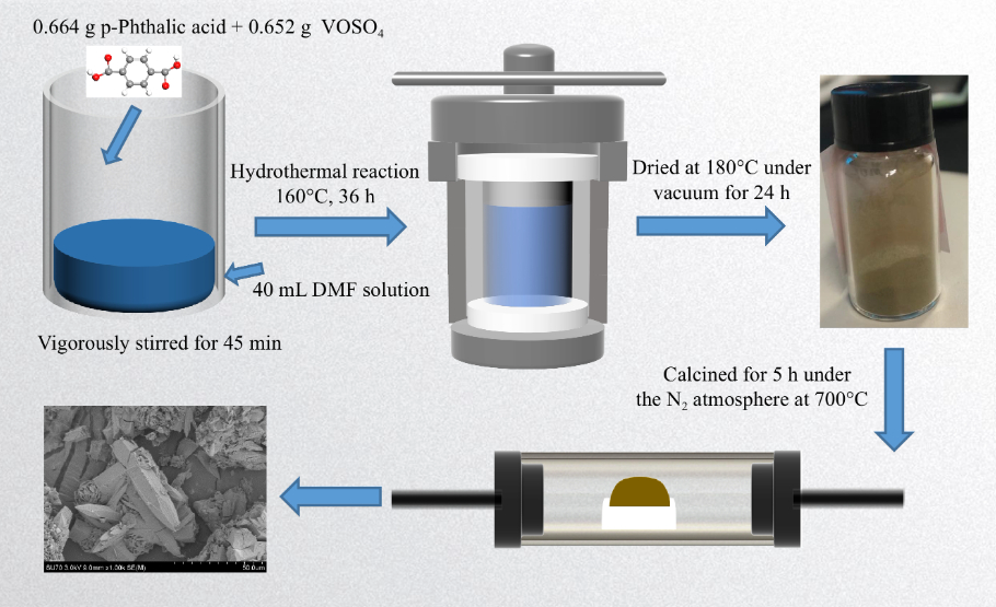采用簡單的水熱反應和煅燒法制備了具有子彈狀結(jié)構(gòu)的釩基MOFs材料。首先,將0.652 g硫酸釩氧化物水合物(VOSO4,Alfa,純度99.9%)和0.664 g對苯二甲酸(Alfa,純度98%)溶于45 mL二甲基甲酰胺(DMF,Alfa,純度99.8%)溶液中,在100 mL不銹鋼高壓釜中劇烈攪拌45分鐘。160°C保溫36 h后用甲醇洗滌8次,離心后將得到的固體在180°C真空干燥24 h,最后在700°C N2氣氛下煅燒5 h,便能得到釩基MOFs材料。