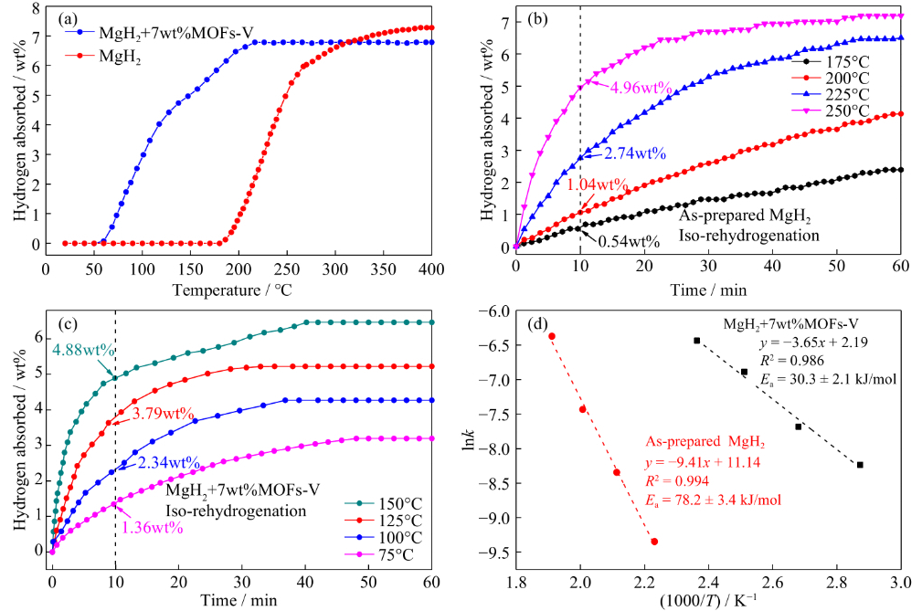 圖3. (a) MgH2和MgH2+7wt%MOFs-V復合材料在不同溫度下的吸氫曲線。(b) MgH2和(c) MgH2+7wt%MOFs-V復合材料的恒溫吸氫曲線。(d) MgH2和MgH2+7wt%MOFs-V復合材料的Arrhenius曲線擬合。