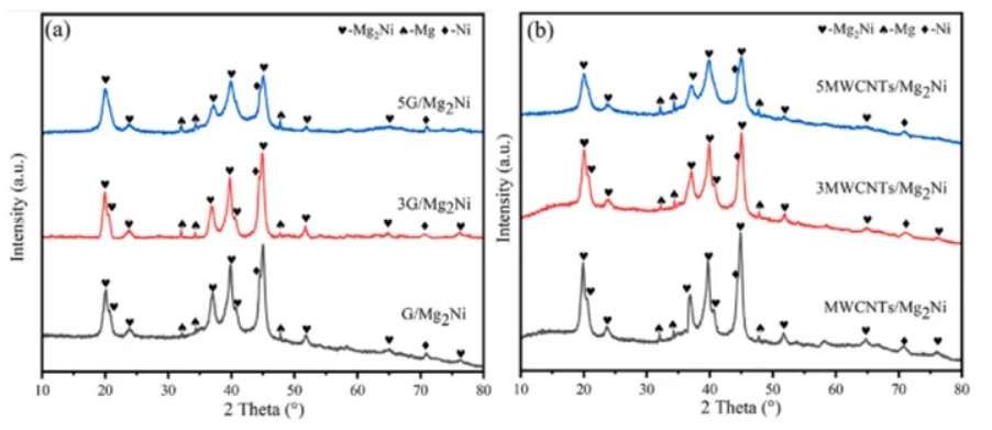 首先稱取45.3g鎂粉、54.7g鎳粉和3g硬脂酸(用作過程控制劑)。為了平衡Mg在球磨過程中的損失,額外添加4wt %的Mg,然后均勻混合并放入高能球磨機中。為了防止球磨過程中的氧化,在氬氣保護(hù)氣氛下進(jìn)行了研磨。球料比為15∶1,采用3mm不銹鋼球,球磨機以900r/min和1000r/min的速度交替運行,研磨時間為5h。在球磨過程中使用循環(huán)冷卻方式,使球磨腔溫度維持在35℃左右。使用石墨烯和MWCNTs對Mg2Ni合金進(jìn)行復(fù)合改性。