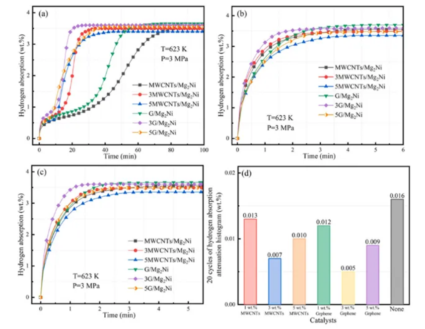 當(dāng)添加量為3wt%時表現(xiàn)出最佳的吸氫性能,在475K的溫度下,在200s內(nèi)迅速達(dá)到吸氫的飽和狀態(tài),在達(dá)到吸收溫度后表現(xiàn)出穩(wěn)健的吸氫動力學(xué)。隨著5wt%MWCNTs的引入,放氫飽和溫度為545K,放氫速率也略有上升。與MWCNTs樣品相比,3G/Mg2Ni在476K左右表現(xiàn)出更冷的吸氫量,具有更強的動力學(xué)特性,可以在150s內(nèi)快速達(dá)到吸氫飽和。