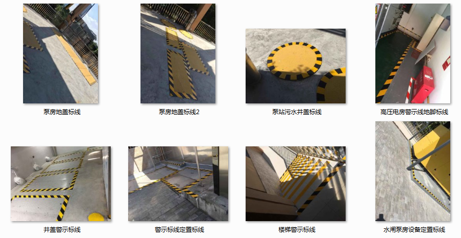 廣東省廣州市大中型水閘,泵站的標志標線的設置和管理,以及小型水閘,泵站,水電站工程和其它水利工程的標志標線設置和管理都是走在前沿的。所有標線的設置也是要依據國標執行,大中型水閘,泵站標線按GB-5768-2009的標準來執行,包括大中型水閘,泵站地面標線,樓梯警示標線,設備定置標線,安全警示標線等上,這些標線可以分兩種一種是熱熔標線,一種是冷噴或冷涂標線,一種適合水閘泵示戶外區域設置,第二種適合室內使用,施工方便。具體施工圖例如下: